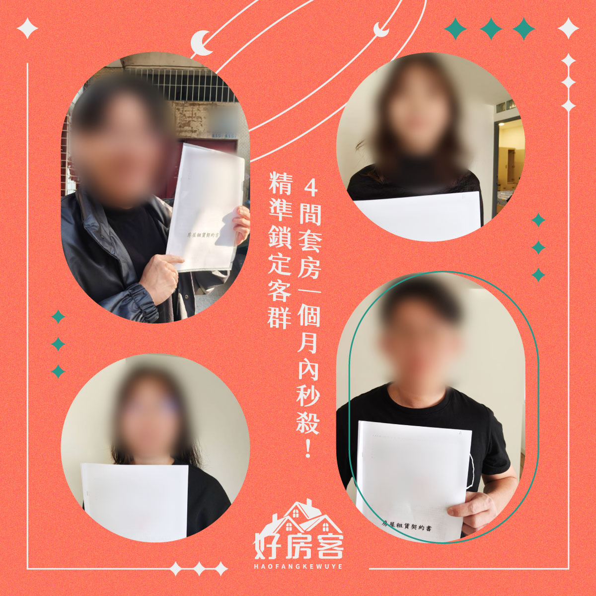 透過積極媒合、多組帶看與清楚溝通條件,最終以跌破大家眼鏡的速度,短短不到1個月內便成功將 4 間套房全數出租!